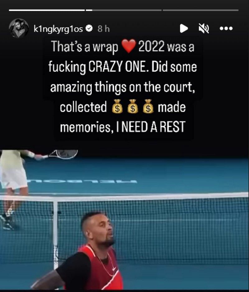 "That's a wrap. 2022 was a f***ing CRAZY ONE. Did some amazing things on court,, collected money, made memories, I NEED A REST," Nick Kyrgios captioned his Instagram story.