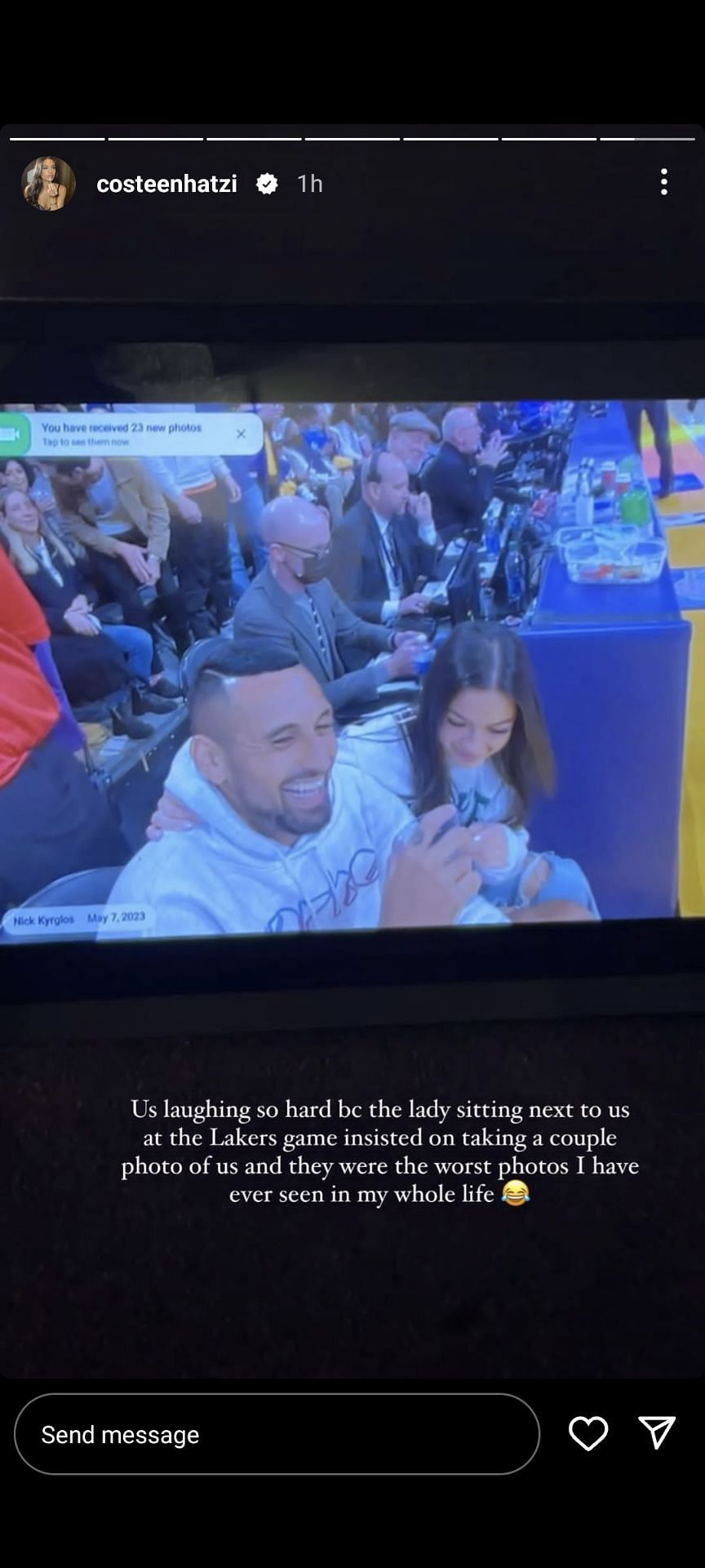 “Us laughing so hard bc the lady sitting next to us at the Lakers game insisted on taking a couple photo of us, and they were the worst photos I have ever seen in my whole life,” Hatzi wrote on her IG story.