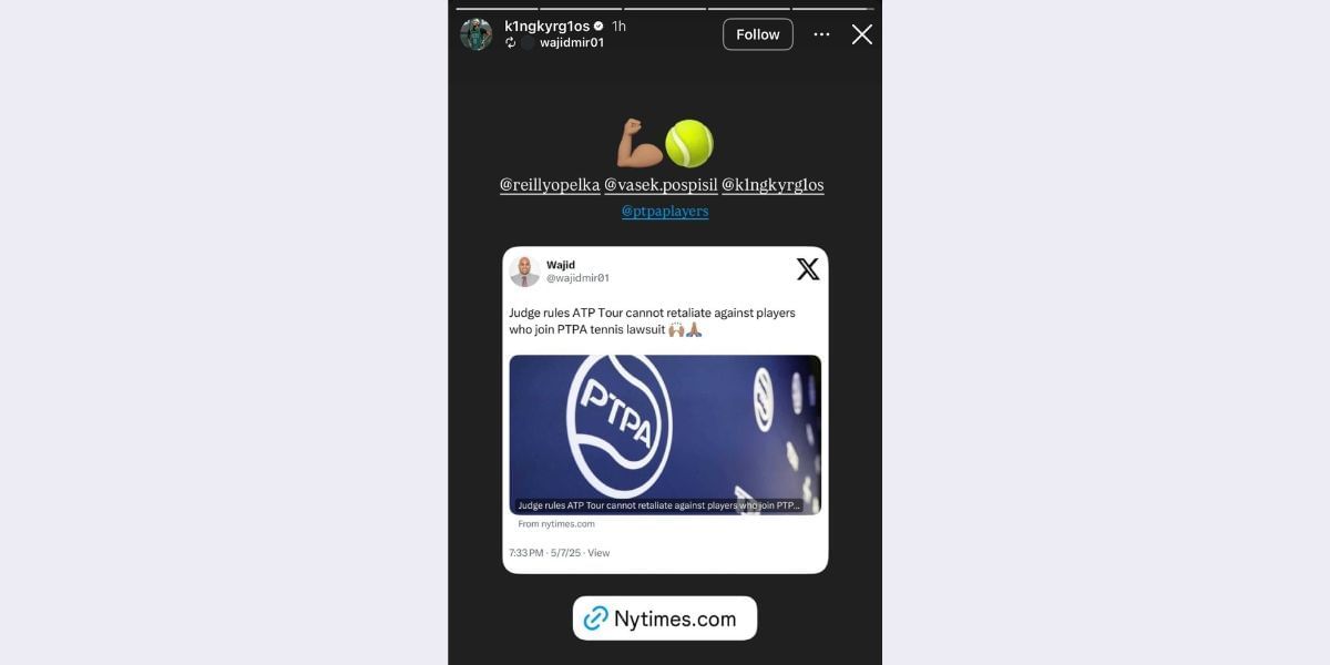 The lawsuit raised a concern amongst active players about whether ATP would treat them any differently now that their wrongdoings have come out publicly, with a few players playing a significant role. The ruling on May 8 provided players with some clarity as Kyrgios reshared an update on the case by NY Times, along with two emojis.