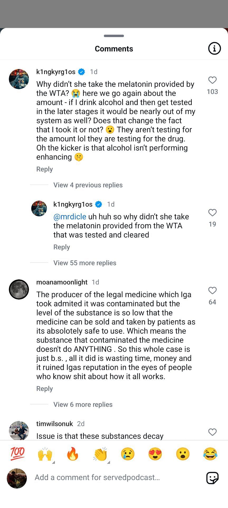 "Why didn’t she take the melatonin provided by the WTA? Here we go again about the amount - if I drink alcohol and then get tested in the later stages it would be nearly out of my system as well? Does that change the fact that I took it or not? They aren’t testing for the amount lol they are testing for the drug. Oh the kicker is that alcohol isn’t performing enhancing," Kyrgios commented.