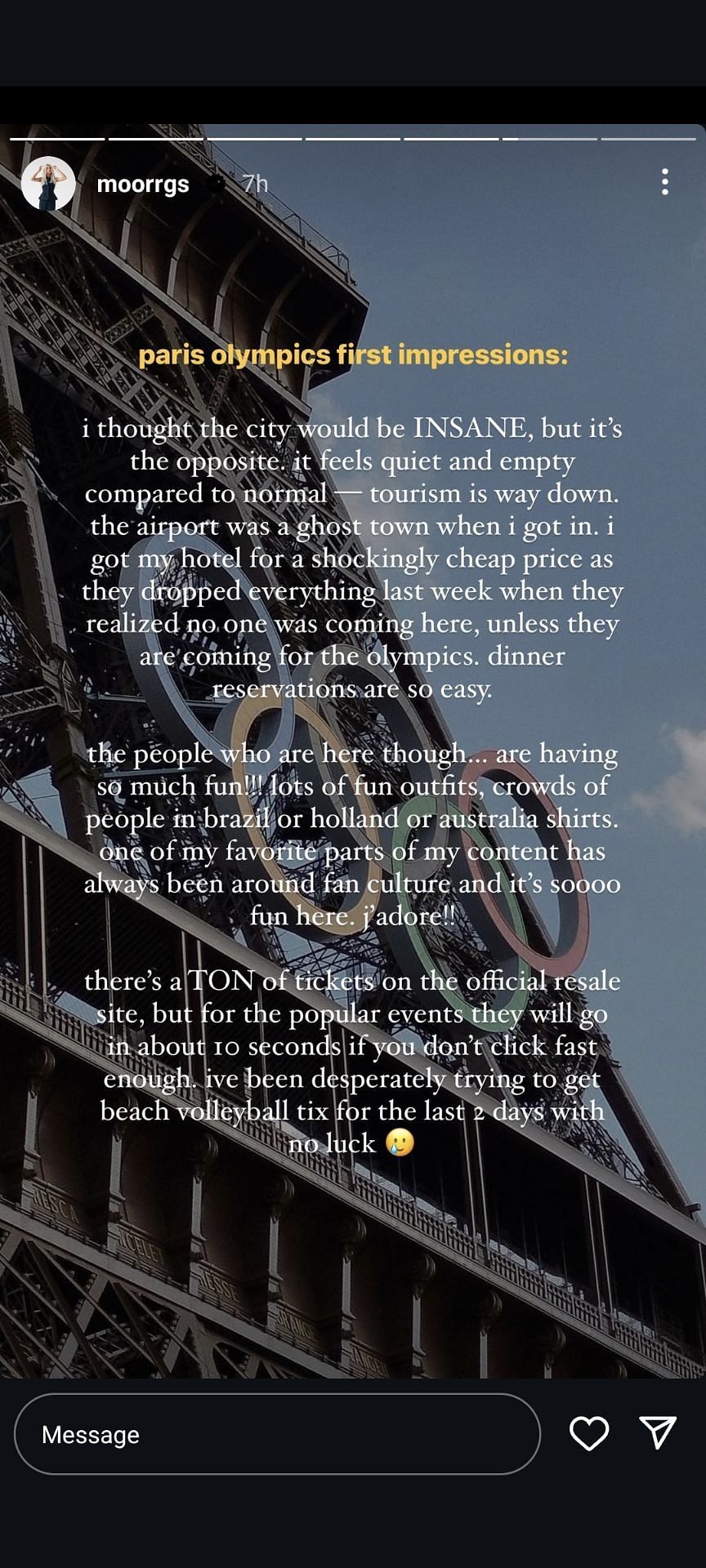 Riddle recently joined boyfriend Fritz in Paris, and as has become the norm for her, is capturing as much content as possible to take her followers into her Paris Olympics experience. Recently, the influencer took to Instagram to share her honest assessment of the Games in the French capital. She stated that when she arrived in Paris, the city wore a deserted look with empty restaurants and hotels all offering services for dirt-cheap prices. In her Instagram stories, she wrote: