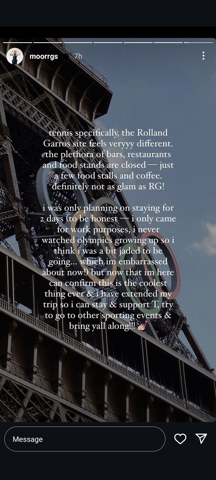 "I was only planning on staying for 2 days to be honest - I only came for work purposes, I never watched Olympics growing up so I think I was a bit jaded to be going... which I'm embarrassed about now! But now that I'm here, I can confirm this is the coolest thing ever & I have extended my trip so I can stay and support T (Fritz), try to go to other sporting events & bring y'all along!!!".