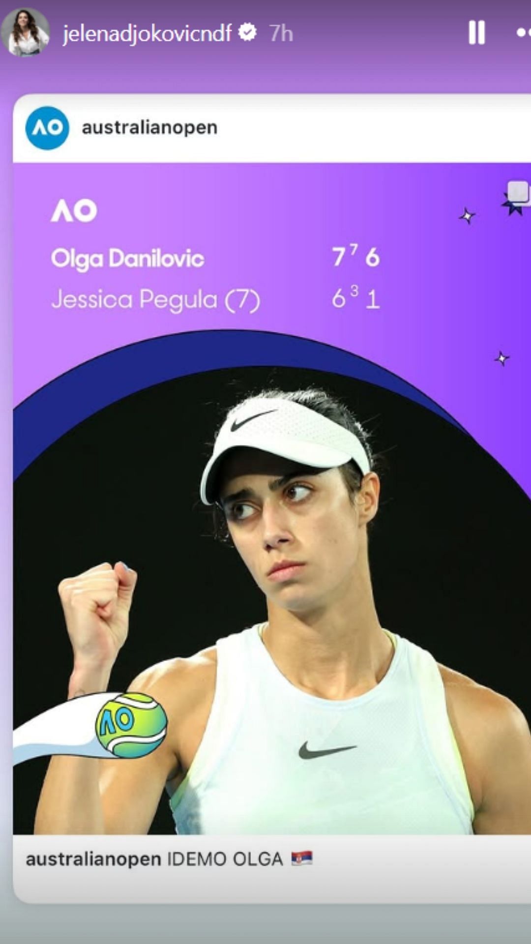 Jelena reposted the Australian Open's official Instagram post announcing the result. Later, she also shared a reel of her husband Novak Djokovic celebrating Danilovic's victory backstage at the arena.