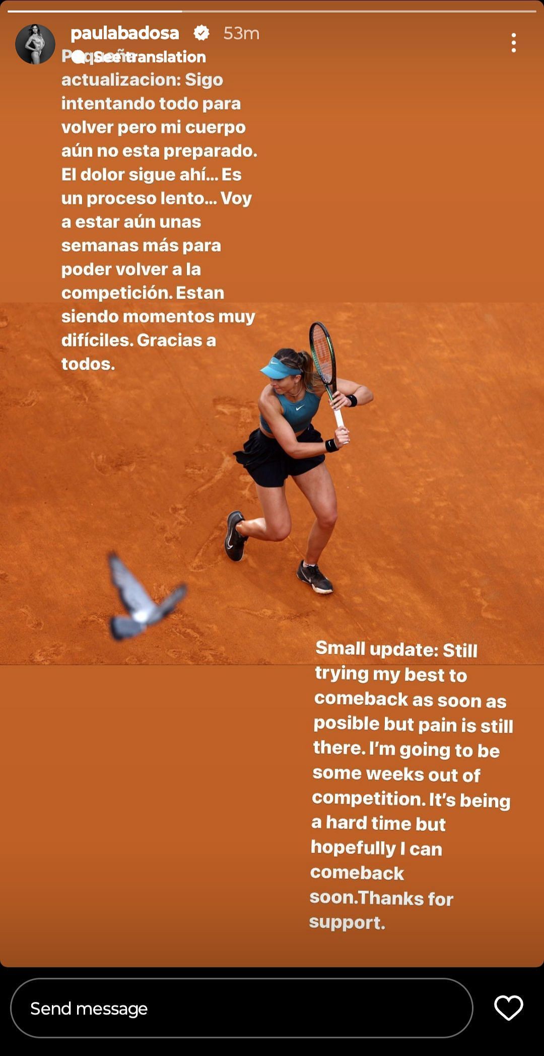 Badosa sustained a spinal stress fracture during this year's Italian Open, which forced her withdrawal from the French Open. She had shared an update online with her fans, saying: