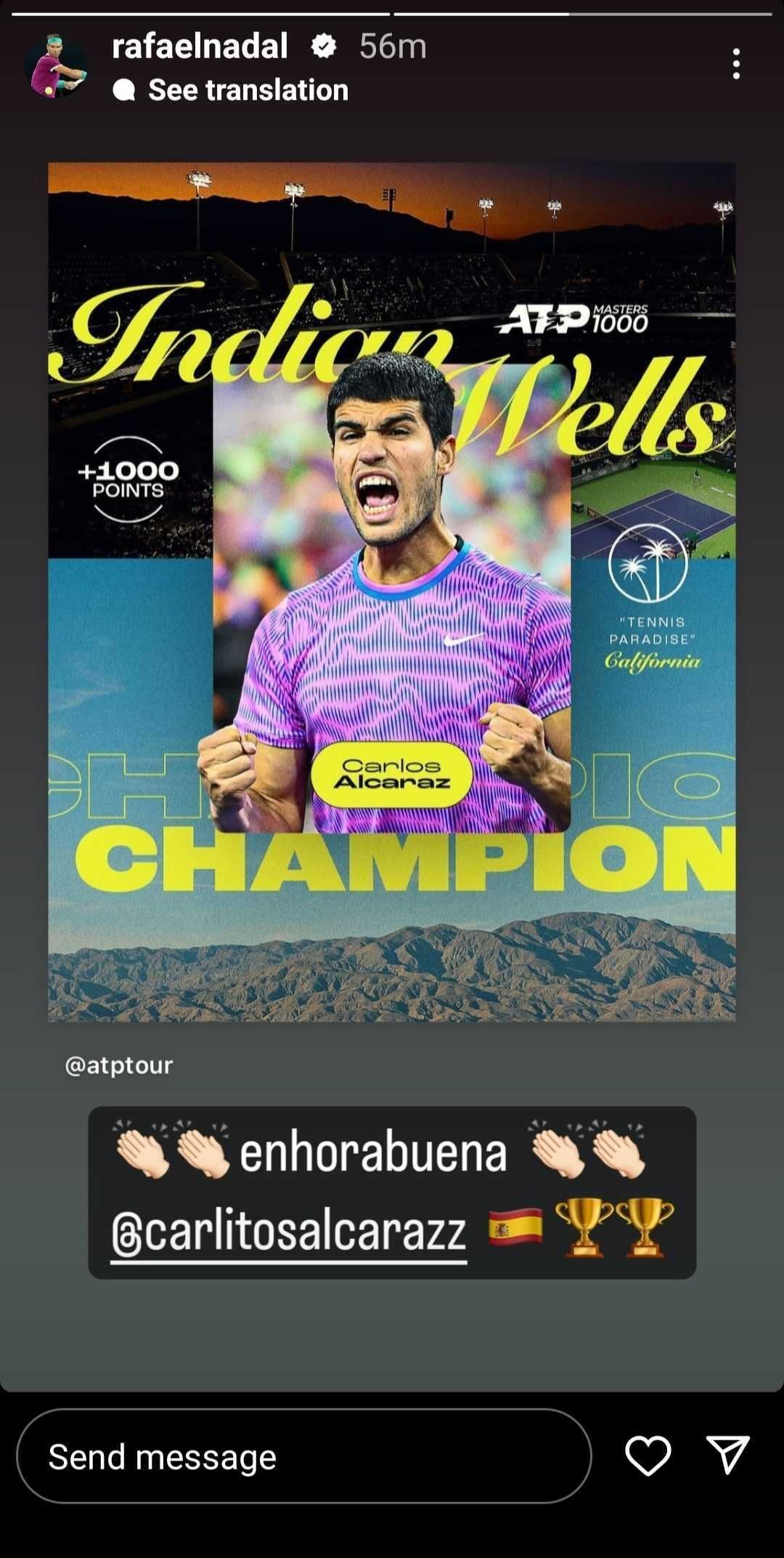 "Congratulations," Nadal wrote in an Instagram post (translated from Spanish), where he also tagged Alcaraz.