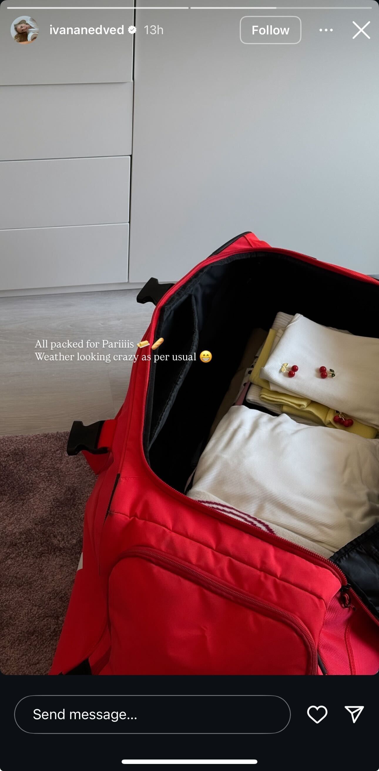 Ivana Nedved shared a picture on her Instagram story that showed an open red duffle bag with clothes stacked neatly inside. It also gave a peek of her knit tops embellished with cherry pins. She captioned it: