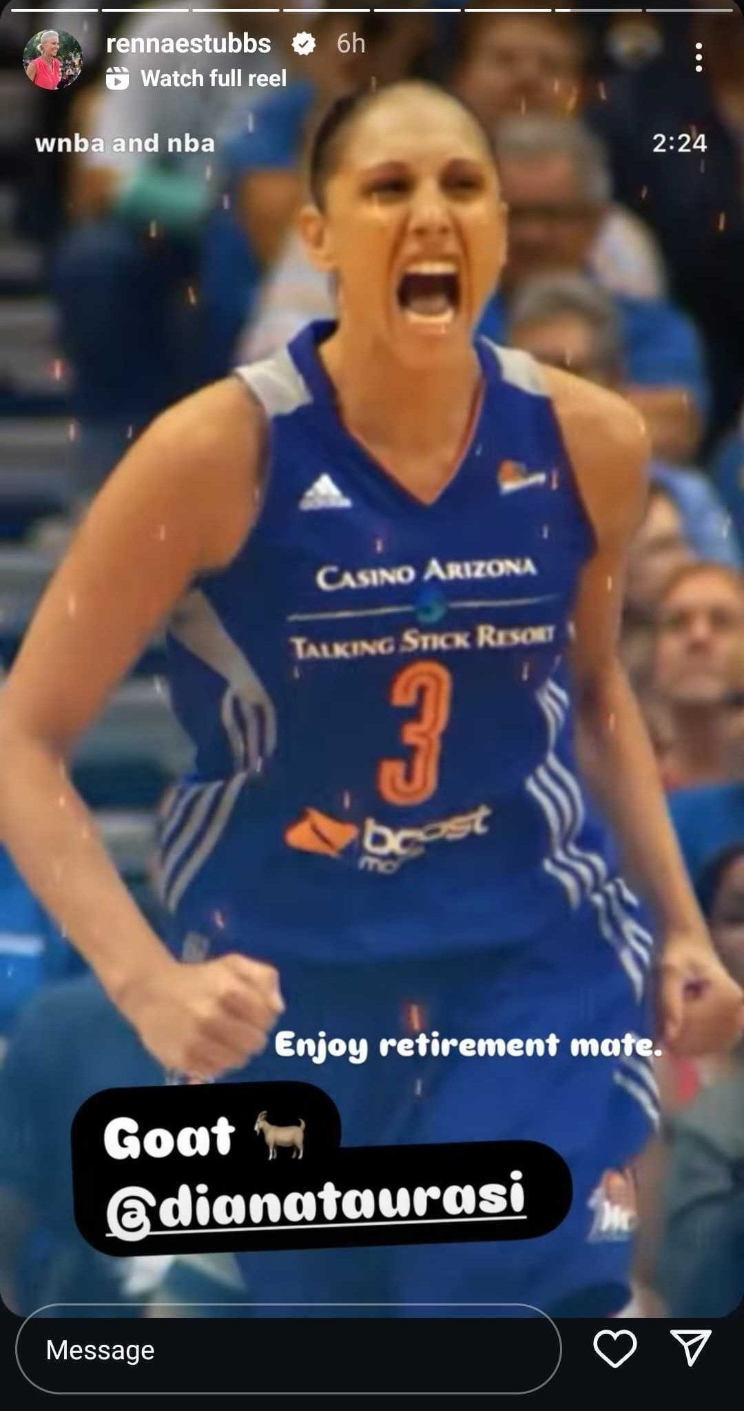 "Enjoy retirement mate. Goat 🐐," Stubbs wrote, with her post featuring a still of Taurasi celebrating intensely from a reel that the WNBA made in her honor.