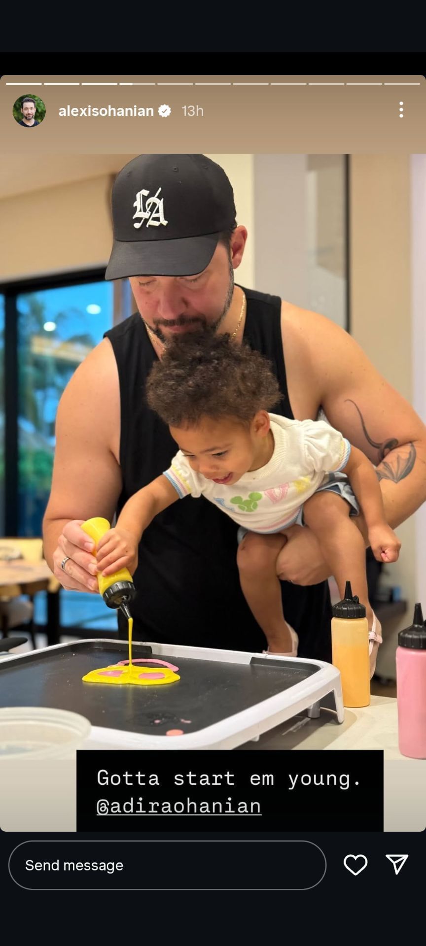 The Brooklyn native shared a video of Olympia making an elaborate pancake design on his Instagram story. Moreover, he shared an adorable snap holding his baby daughter Adira and helping her make a pancake. Ohanian captioned the image: