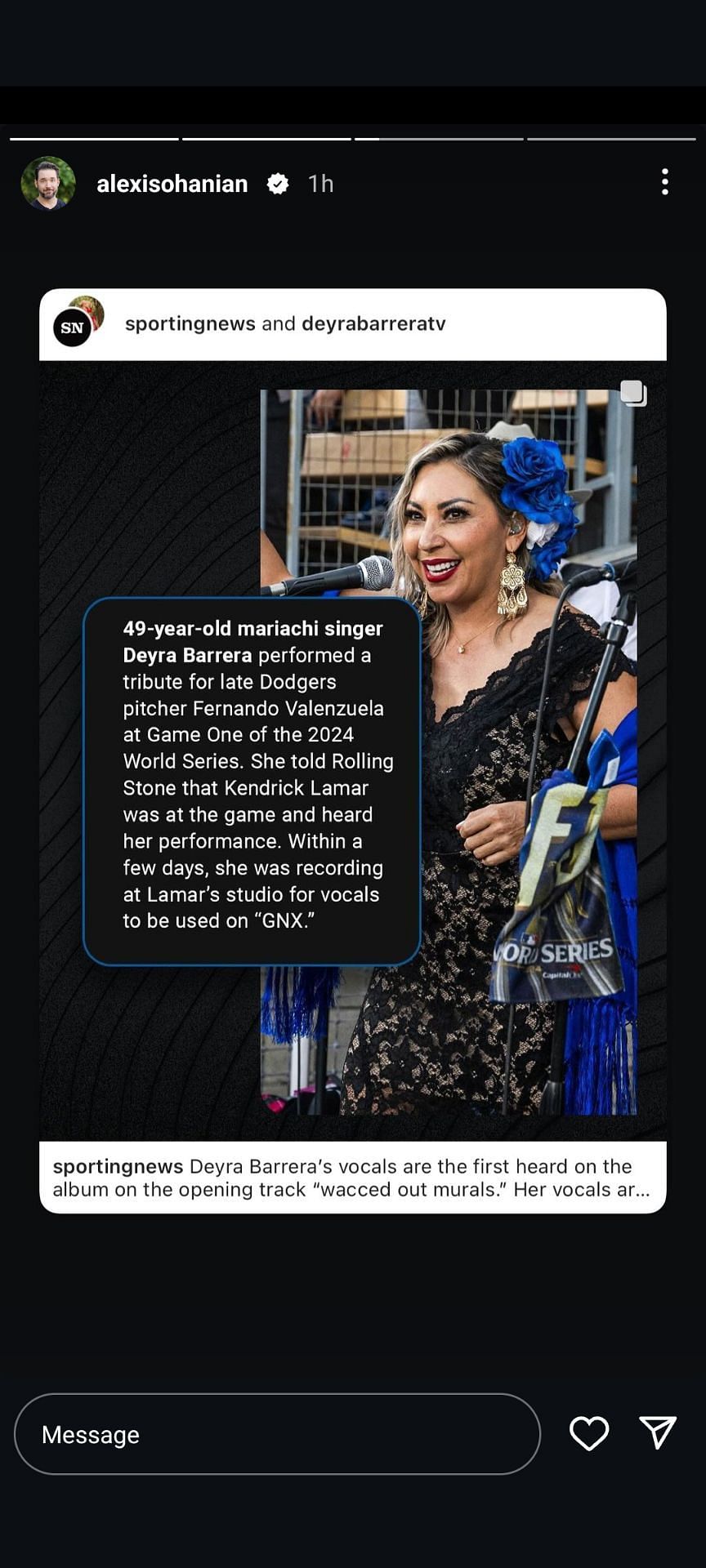 At Game One of the 2024 World Series, mariachi singer Deyra Barrera performed a tribute song for the late Valenzuela. Grammy and Pulitzer-winning rapper Kendrick Lamar, who was in attendance, was left impressed. According to Barrera, within a few days, she found herself recording vocals for Lamar's new album, "GNX".
