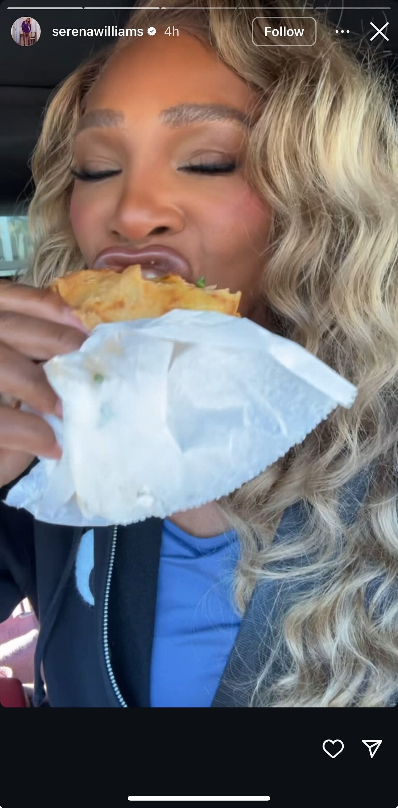 In the very next post, Serena Williams' mood had completely changed, as she voraciously munched on a snack. While she didn't specifically reveal what snack she was having, it appeared to be a taco.