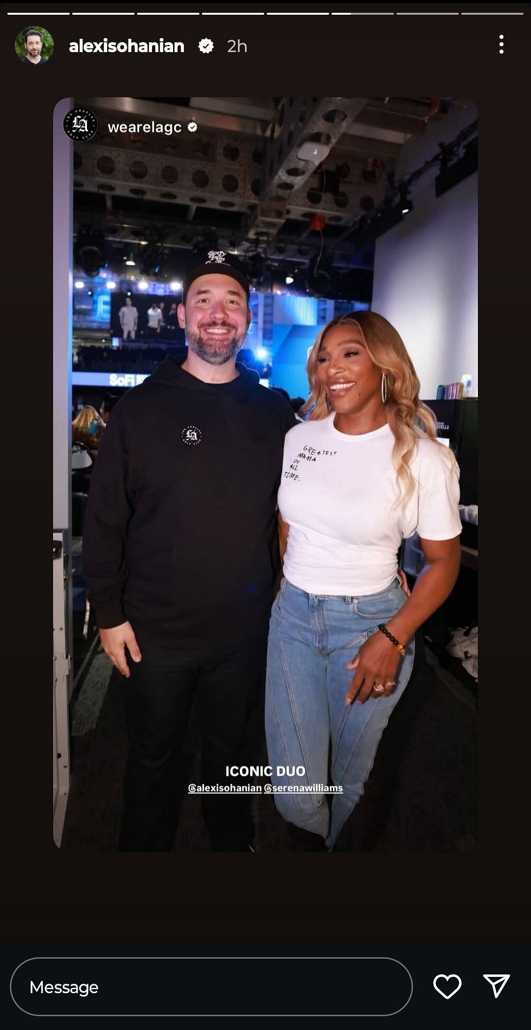 On the match day, Williams, a mother of two daughters, wore an iconic 'Greatest Mama of All Time' t-shirt. The LAGC's official Instagram account shared a story of Williams and Ohanian posing, calling them the 'iconic duo.' Later, the Reddit co-founder reshared the story.