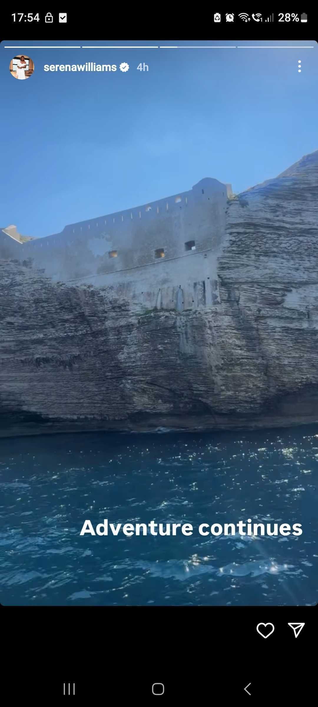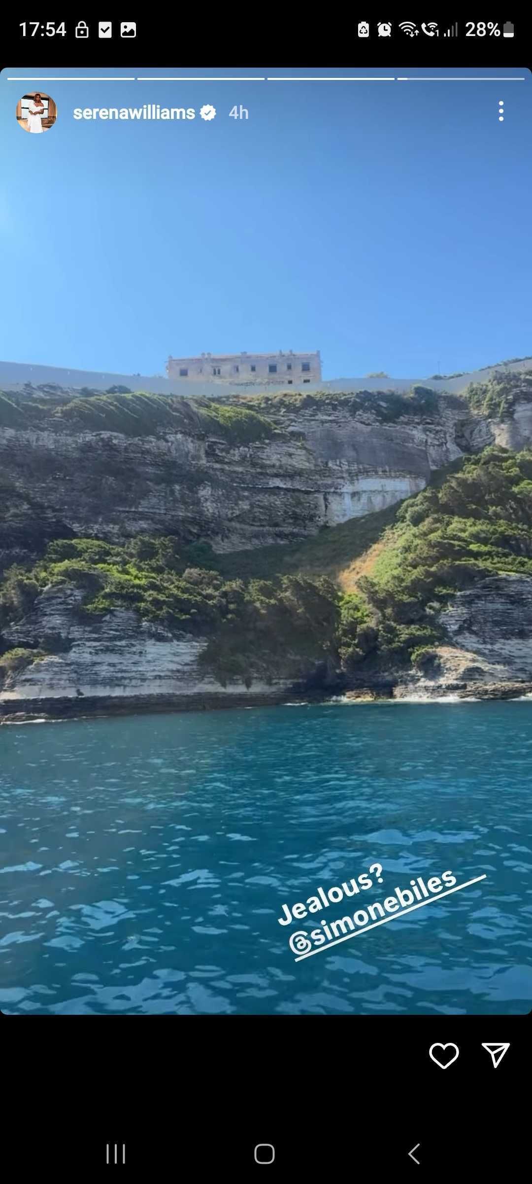 Serena Williams teased her good friend and Olympic gymnast Simone Biles with her holiday images from Corsica, just off the south of France. Serena appears to be on a yacht sailing past the famous Bonifacio White Chapel, whose vast cemetery wall dominates the Corsican coastline.