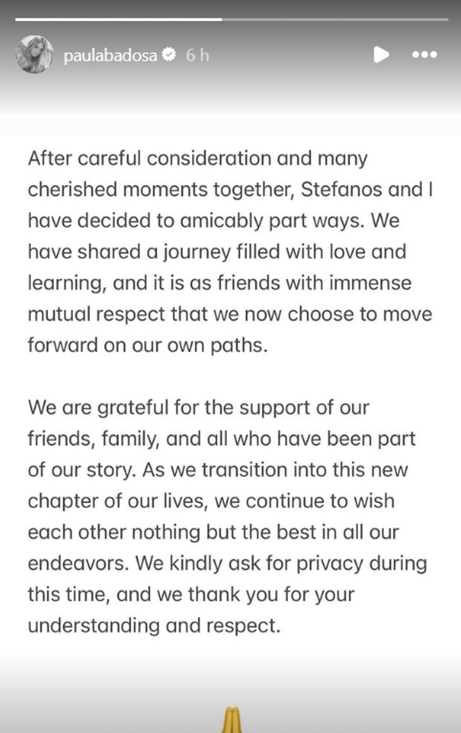 "After careful consideration and many cherished moments together, Stefanos and I have decided to amicably part ways. We have shared a journey filled with love and learning, and it is as friends with immense mutual respect that we now choose to move forward on our own paths. We are grateful for the support of our friends, family, and all who have been part of our story," the Spaniard wrote.