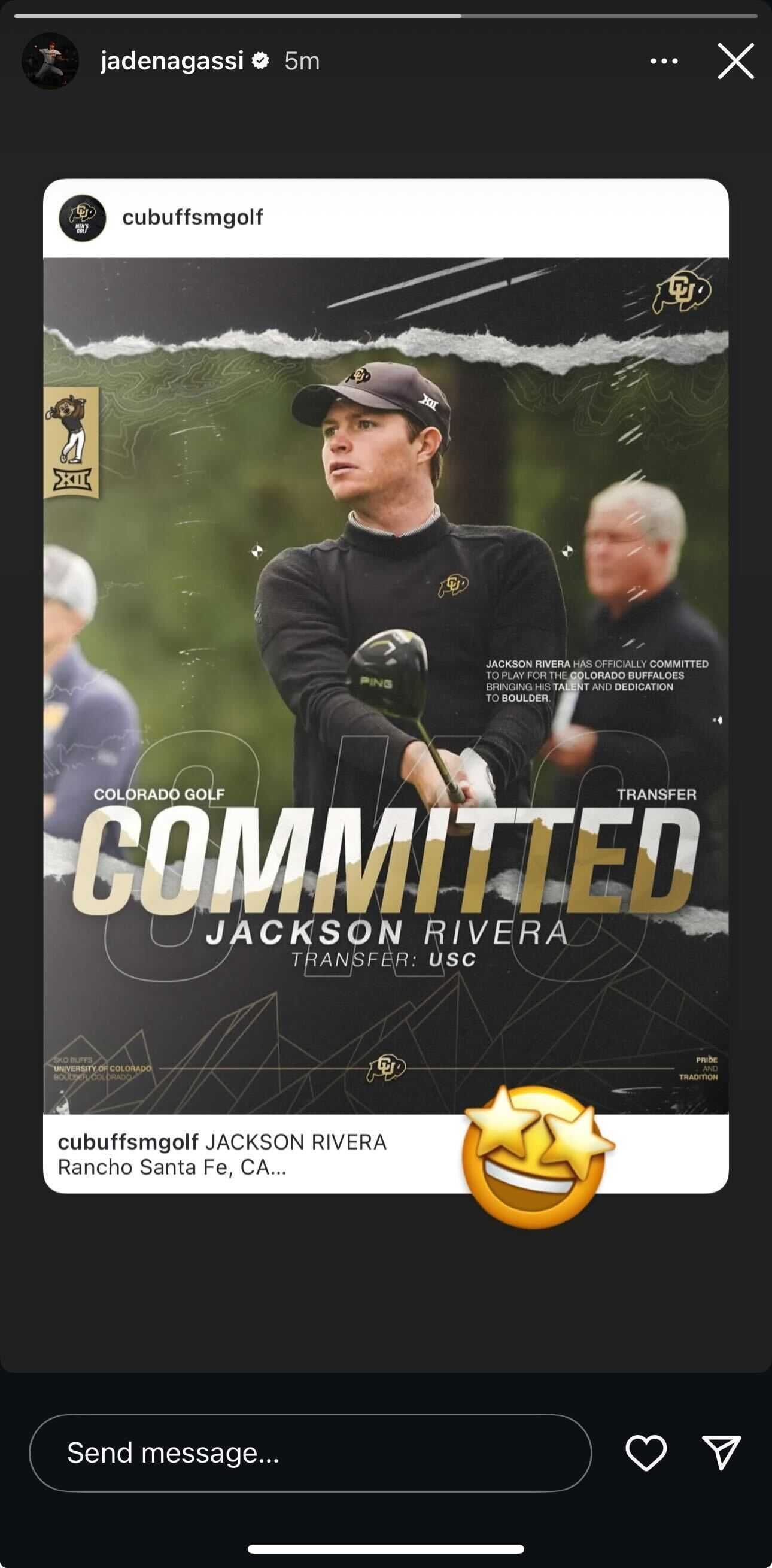 Jaden Agassi relayed the news of Rivera's transfer on his Instagram account, captioning the post with a star-struck emoji: