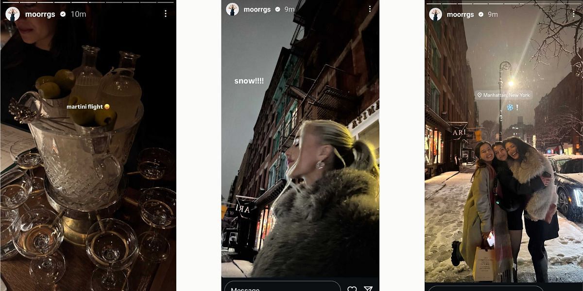 Taking to Instagram, Riddle shared several images from her outing in New York on Saturday, February 8. She indulged in a Martini flight, sharing a glimpse of the elegantly served drinks. Stepping outside, she admired the snowfall, capturing a stylish moment in a fur coat. Later, her friends posed happily on the snowy Manhattan streets.