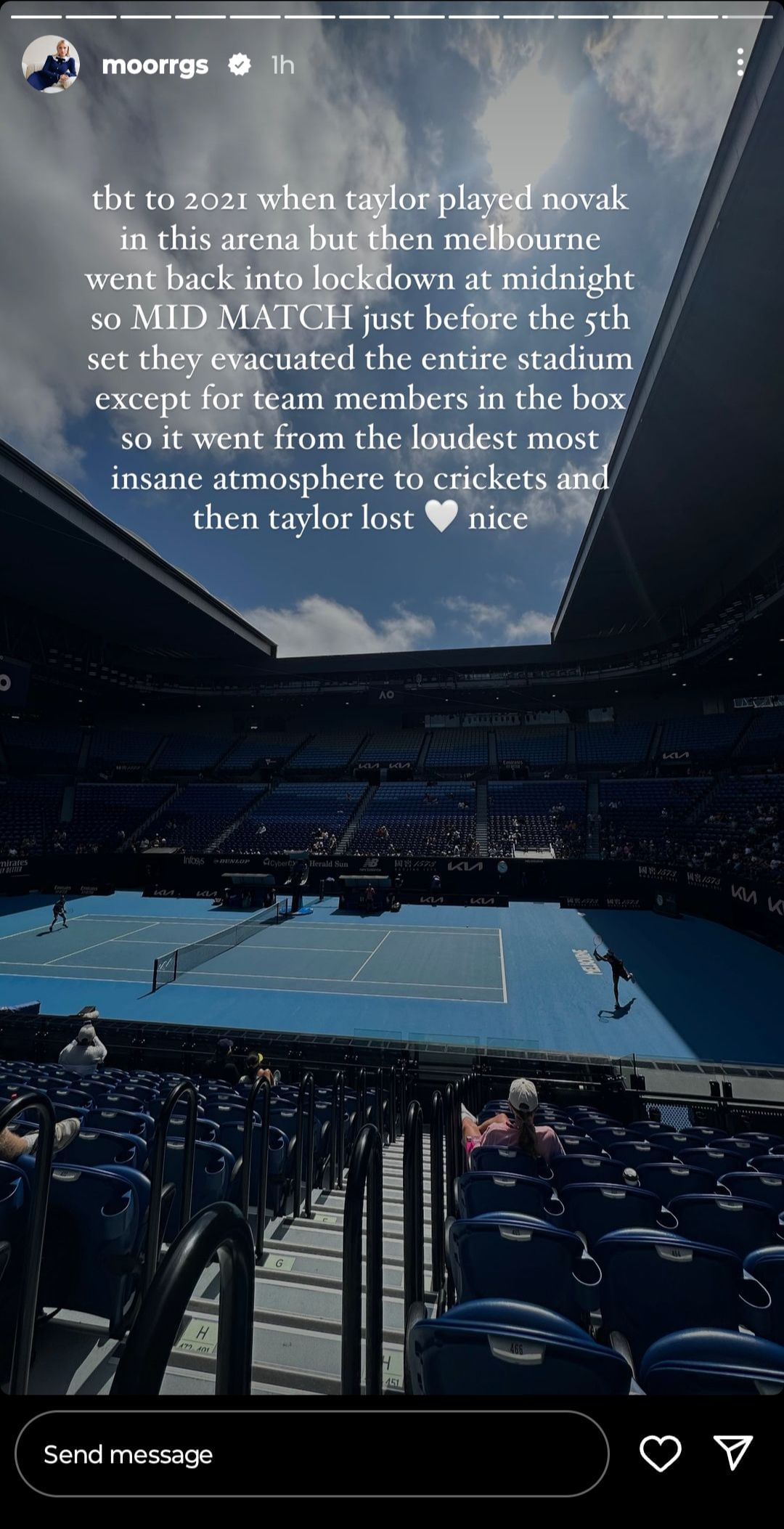 "Tbt to 2021 when Taylor played Novak in this arena but then Melbourne went back into lockdown at midnight. So mid-match just before the 5th set, they evacuated the entire stadium except for team members in the box so it went from the loudest most insane atmosphere to crickets and then Taylor lost. Nice," Riddle wrote.