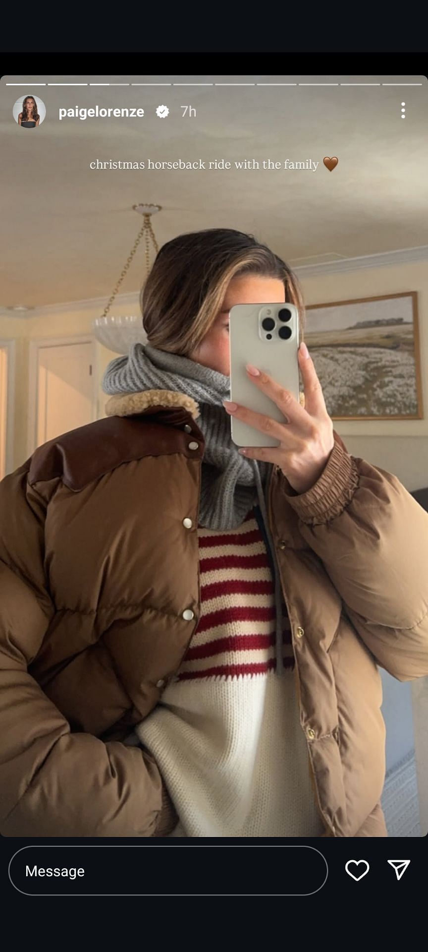 On Wednesday, December 25, Tommy Paul's girlfriend Paige Lorenze took to her Instagram Stories and shared some pictures of her low-key Christmas celebrations. One picture was a selfie that she captured in front of the mirror. The influencer was sporting winter wear, and she captioned the story: