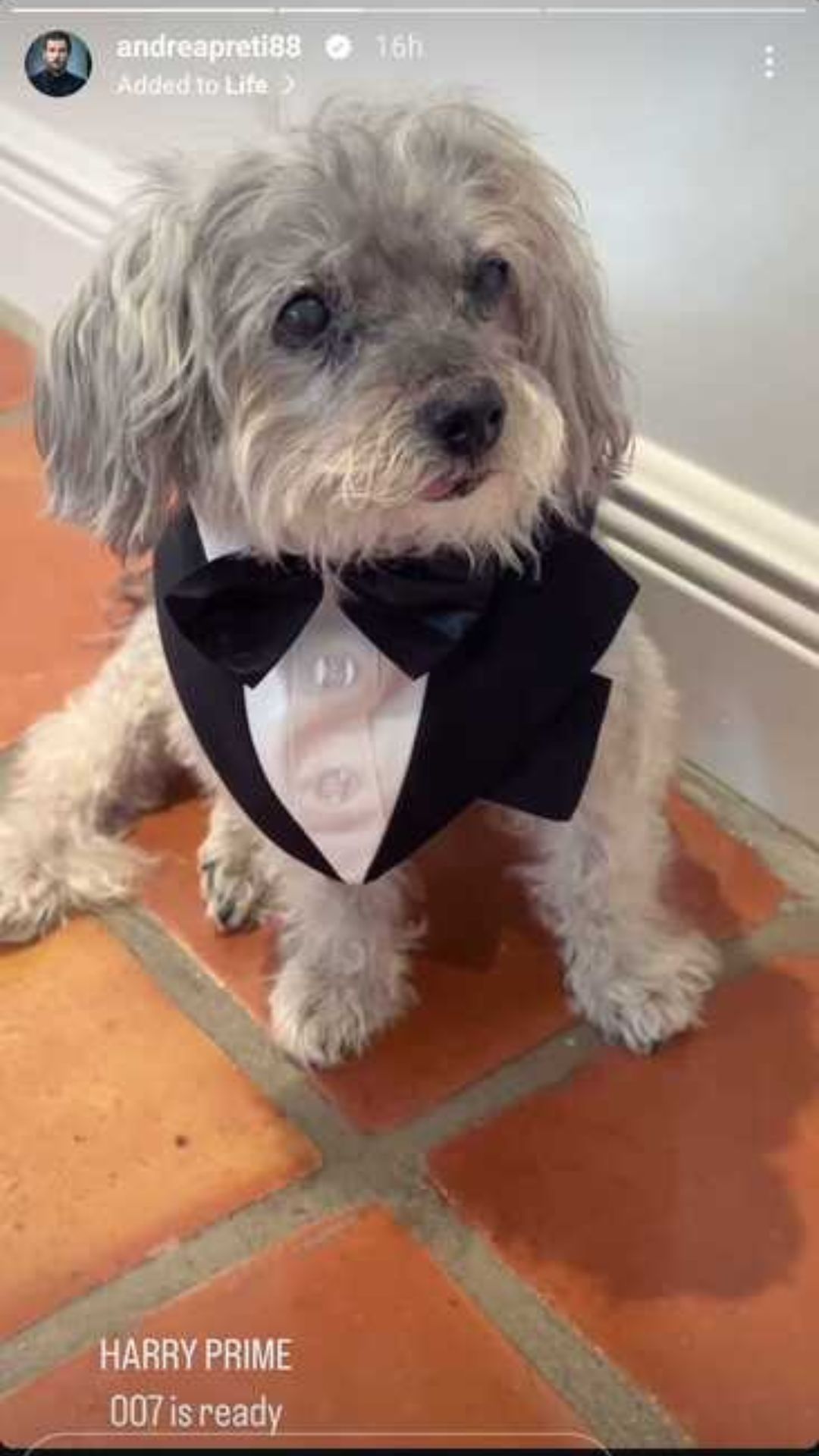 Preti has been regularly sharing images of Harry on his Instagram Story, and his most recent one was an image of the pup dressed in a tuxedo. The Denmark-born actor captioned the image with a James Bond reference: