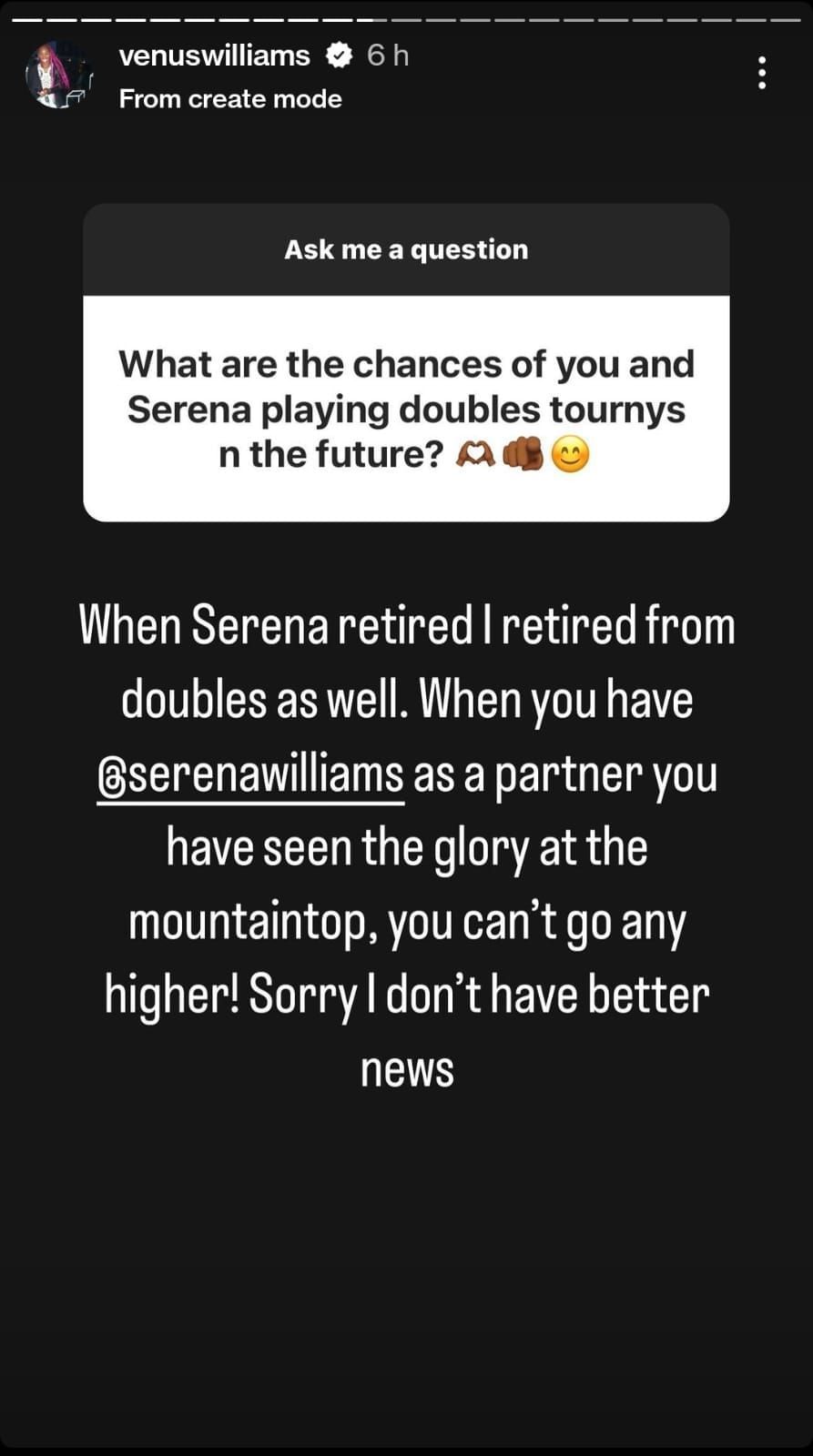 "When Serena retired I retired from doubles as well. When you have Serena Williams as a partner you have seen the glory at the mountaintop, you can't go any higher! Sorry I don't have better news," Venus Williams wrote to a curious fan.
