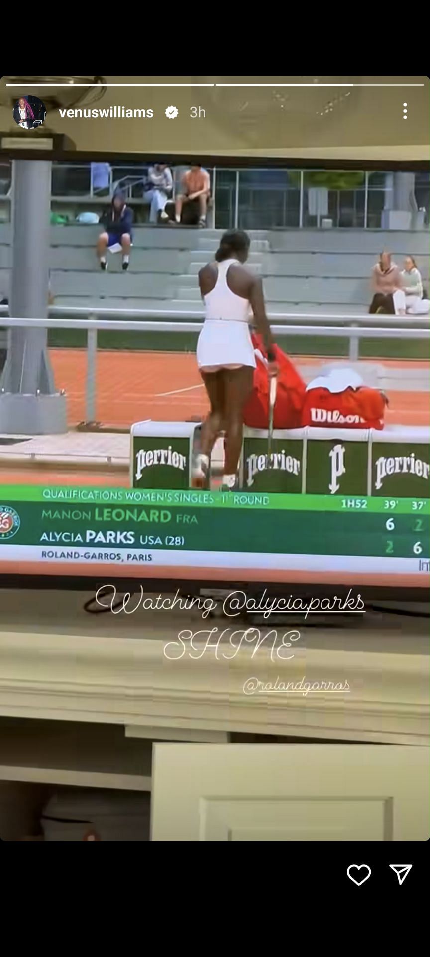 The 43-year-old shared on Instagram that she watched Parks' first-round qualifying match in Paris. Williams, a former Roland Garros finalist, posted a story on Instagram and celebrated her triumph on the court after a long time.