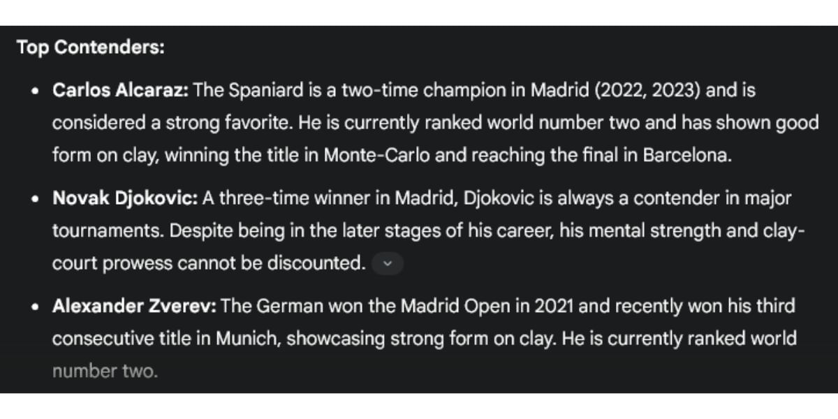 Lastly, the AI chose Zverev as another top choice for the title. Some days ago, he won the BMW Open in Munich, his third title at the venue. He has also reigned supreme in Madrid twice, securing his first title in 2018 and his second triumph in 2021. Given their track record at the tournament, these three are the logical choices to emerge victorious again.