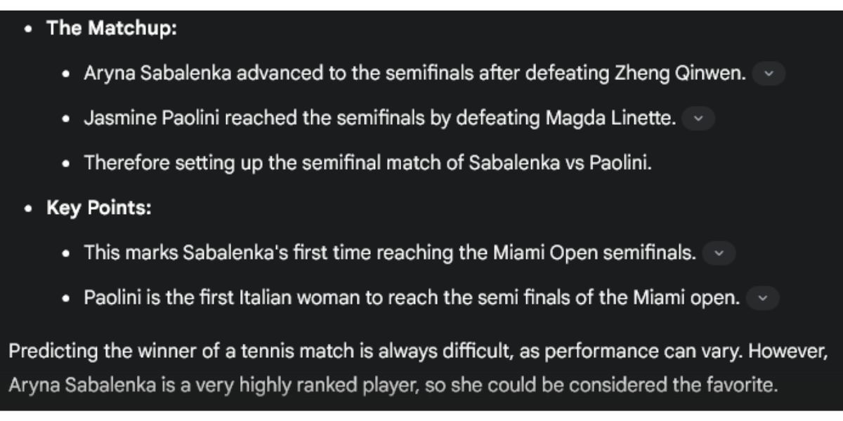 Google's Gemini AI was cautious about predicting the winner, citing various factors that could affect the outcome. However, it ultimately sided with Sabalenka on account of her ranking, which is nothing but a reflection of her strong performances over the past seasons. She has been ranked in the top three of the WTA rankings since the start of 2023.