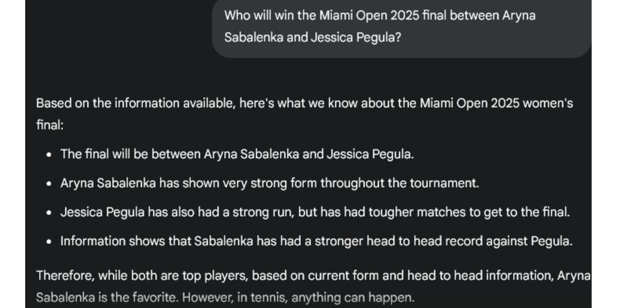 Google's Gemini AI picked Sabalenka to triumph in the final. It rationalized its choice by citing her strong run to the summit clash, having not dropped a set thus far, along with her head-to-head against Pegula, which she leads 6-2.