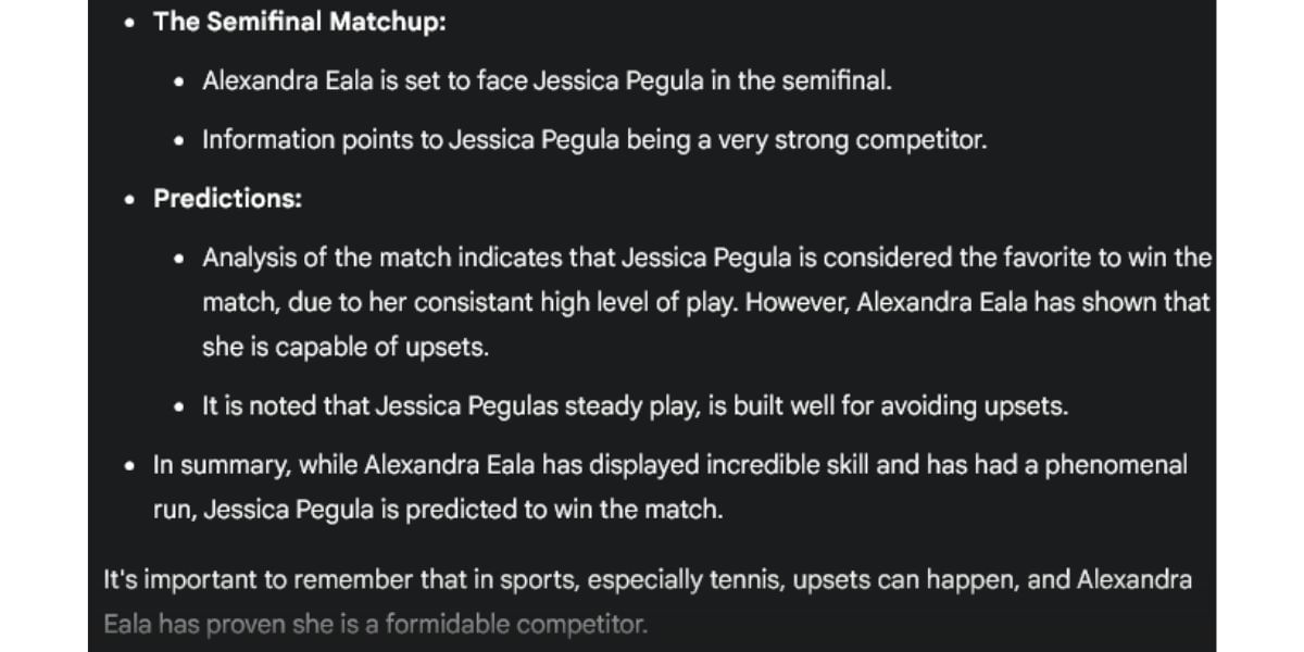 Google's Gemini AI sided with Pegula to come out on top in this encounter, citing her consistency. Nevertheless, it also considered Eala a huge threat given her display of impeccable tennis in Miami over the past week.