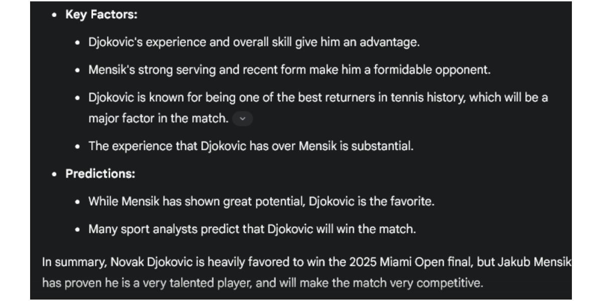 Google's Gemini AI gave Djokovic the edge to win this contest. While it issued a word of caution given Mensik's talent and rising profile, the Serb's experience and skills could ultimately sway the tide in his favor.