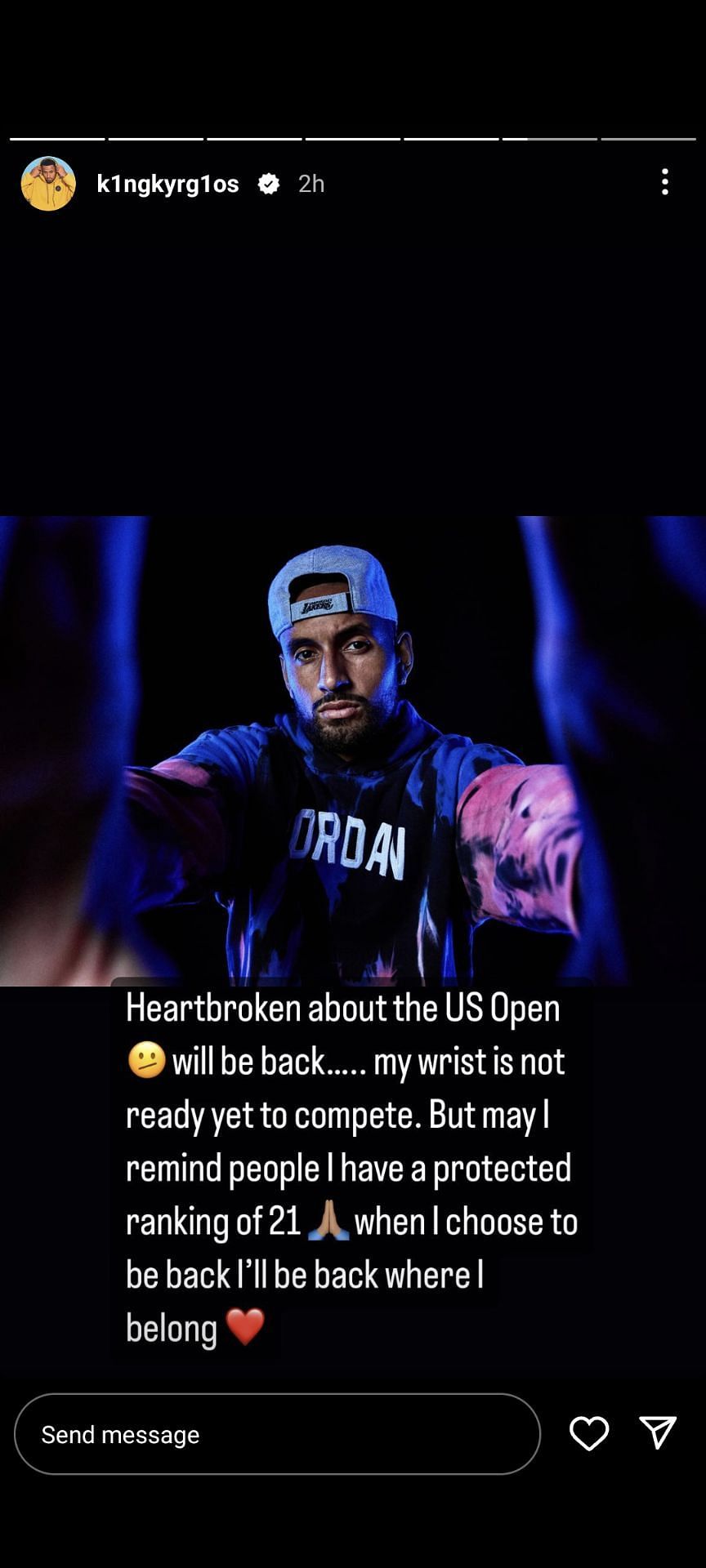 "Heartbroken about the US Open, will be back....my wrist is not ready yet to compete. But may I remind people that I have a protected ranking of 21. When I choose to be back, I will be back where I belong," Kyrgios captioned his Instagram story.