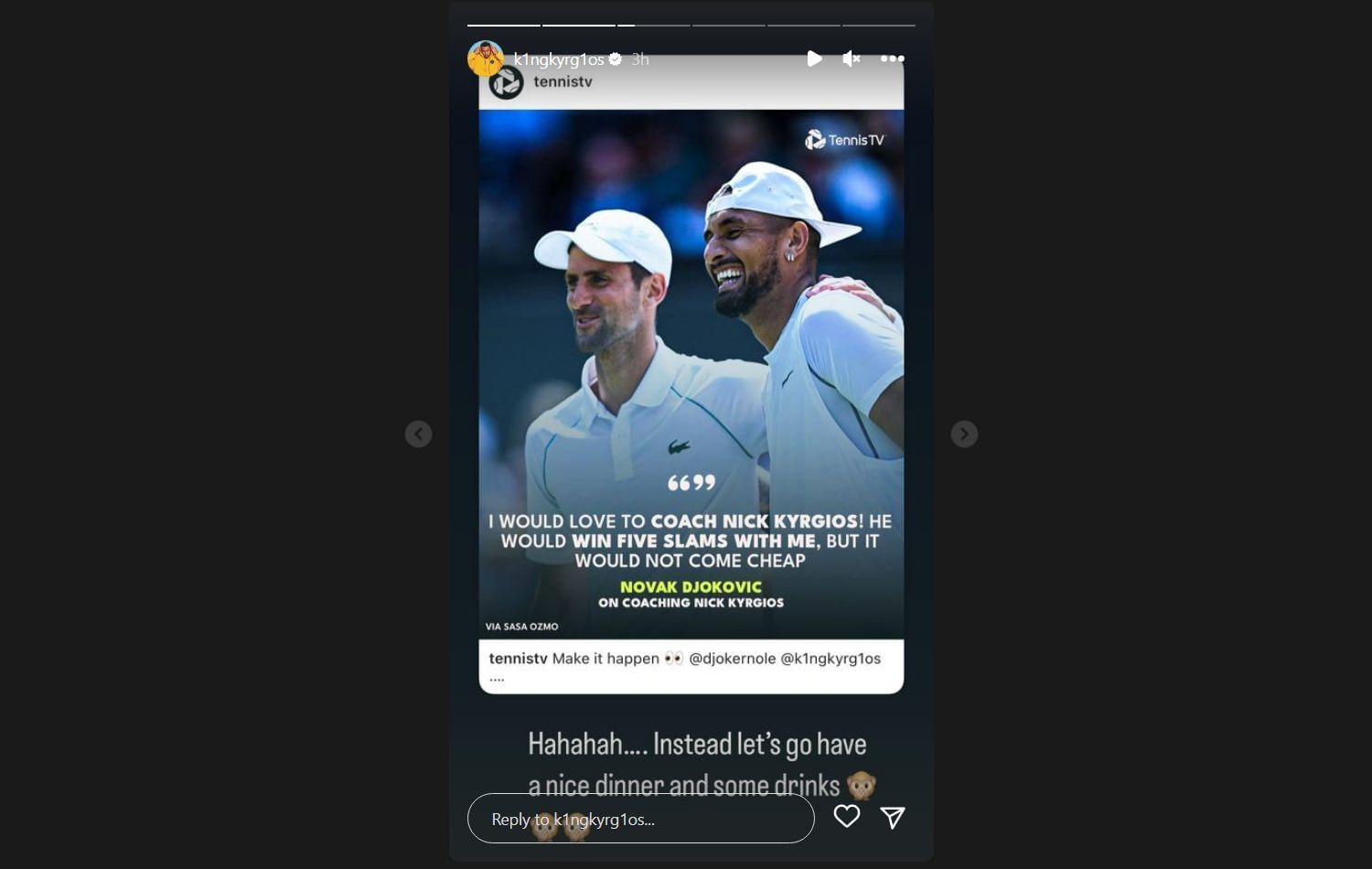 Kyrgios immediately reacted to the comment on his Instagram stories, offering the Serb a nice dinner and some drinks.