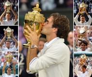 A combination of photographs created on July 8, 2012 shows Roger Federer of Switzerland holding up his 7 Wimbledon trophies. Swiss great Roger Federer won his seventh Wimbledon men’s singles title at the Wimbledon Championships tennis tournament in Wimbledon, southwest London on July 8, 2012. Federer’s 7 Wimbledon victories are: Centre: Wimbledon 2012, left column top to bottom: 2004, 2003, 2005, and right column top to bottom: 2009, 2006 and 2007. (AFP/GettyImages)