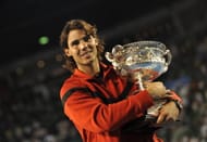 Rafael Nadal of Spain holds his trophy after the men’s tennis final on day 14 of the Australian Open in Melbourne on early February 2, 2009. Rafael Nadal won a classic Australian Open final against Roger Federer 7-5, 3-6, 7-6 (7/3), 3-6, 6-2