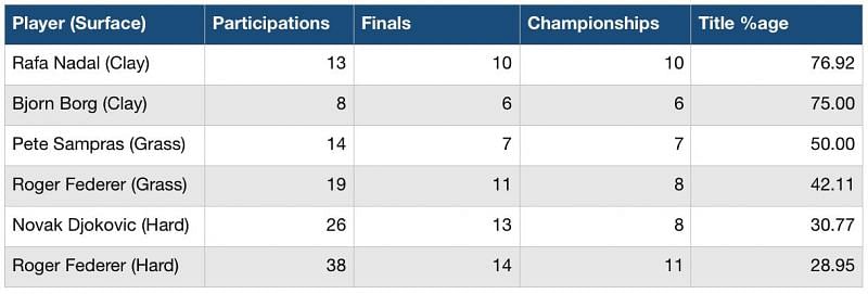With four of the six entries on this list nearing the twilight of their careers (not by performance but by age), and the other two having retired long back, it is fair to assume that there would not be an exaggerated statistical deviation in these records. Based on what we have just seen in the analysis above, Nadal, who will most definitely go down as the best clay court player of all-time (till his era), should not just be looked at from the lens of a clay court player. The lens is actually wider and should accommodate the greatest single-surface player, and while the debate for the Greatest of All Time may never be settled, the Greatest Single-Surface Player of All-Time until his time, is probably the man from Mallorca.
