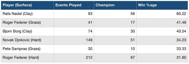 While a player’s Grand Slam record is what is talked about most, the debate for the greatest single-surface player would be rendered incomplete without a look at their performance on the surface across tournaments. The following two tables analyze the win-loss records and the percentage of events won by a player as a factor of the events they took part in.