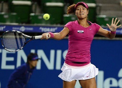 Li Na of China hits a return against Caroline Wozniacki of Denmark during their women’s singles third round match at the Pan Pacific Open tennis tournament in Tokyo on September 26, 2012. Wozniacki won 4-6, 6-3, 6-4.