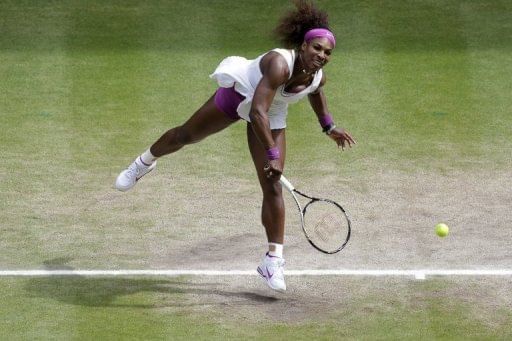 US player Serena Williams plays a forehand shot ahead of being crowned Wimbledon champion for the fifth time. The American subdued a brave fightback from Polish third seed Agnieszka Radwanska to win 6-1, 5-7, 6-2 in a dramatic final.