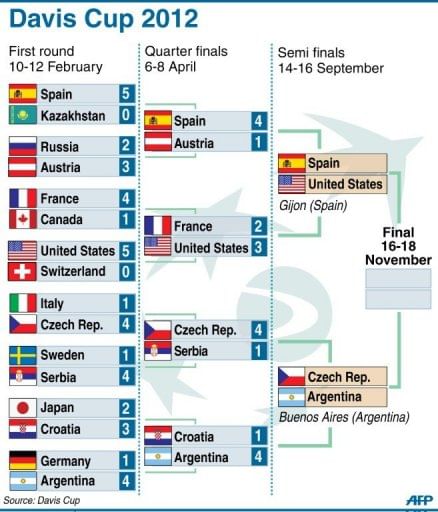 The other semi-final takes place in Buenos Aires with Juan Martin del Potro an injury doubt for Argentina against the Czech Republic.