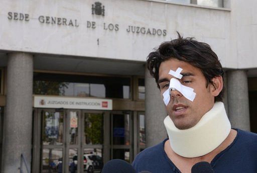 Tennis player Thomas Drouet of Monaco, training partner of Australian tennis player Bernard Tomic, leaves a court house bandaged and wearing a neck brace in Madrid on May 6, 2013. Drouet was allegedly headbutted by Tomic’s father and coach, John Tomic, during an altercation on May 4, 2013 in Madrid.