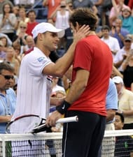 Andy Roddick (L) greets Juan Martin Del Potro following Roddick’s loss in their US Open match on September 5. “I’ve loved every minute of it — for the first time in my career I’m not sure what to say,” said Roddick, who was in tears after his loss.