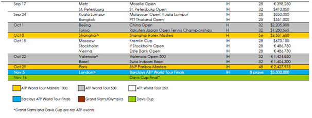 The year round calendar consists of a multitude of events – ATP Masters 1000, ATP Masters 500, ATP World Tour 250, the four Grand Slams (these are not governed by the ATP), Davis Cup, Hopman Cup and of course the World Tour Finals. Unfortunately or fortunately, its the Grand Slams that hog all the limelight, while sometimes, even the Masters events do not get enough media coverage. The viewer’s interest is at a peak during the Grand Slams, and once curtains close on the last Slam of the year – the US Open, many people simply switch off their tennis brains. This happens in mid-September. There are two whole months of non-stop tennis that happens after this, and yet, very rarely do all the top players participate in an event. This is typically called the ‘Fall Season’ of tennis, and it lasts from Sep 21st to Dec 21st. Here is a schedule of the events that happen during this period.