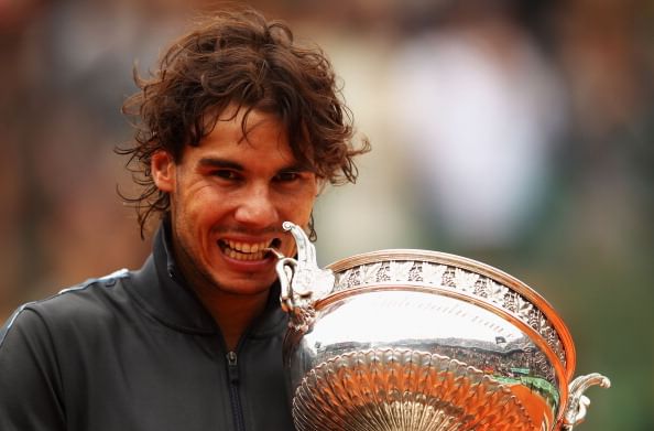 Jun 11, 2012, France: Rafael Nadal celebrates victory with the Coupe des Mousquetaires trophy in the men’s singles final against Novak Djokovic in French Open at Roland Garros