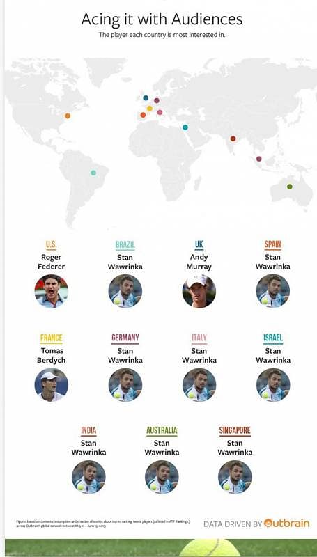 Content discovery platform Outbrain today released data providing insight into who is the most popular tennis player online worldwide. Wawrinka is, combined on average, the most written and read about tennis player, leading the charts in India and taking 18% of the total global interest.