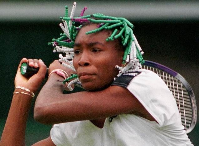 In Wimbledon 1997, Venus Williams did her hair in official Wimbledon colours, adorning it in white, green and purple beads.