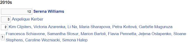 If you look at the table of WTA no. 1 for this decade, it has been 9 different players who have held no 1 ranking, most of them for a very short period of time if you exclude Serena who has occupied it for almost half of the time including the record consecutive 186 weeks of being the number 1 equalling the record of the great Steffi Graf.
