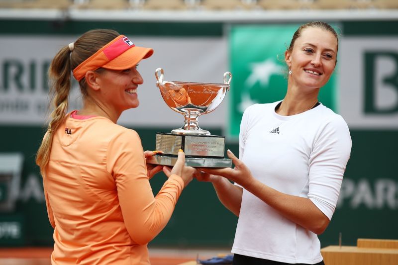 Timea Babos (L) and Kristina Mladenovic with the 2020 French Open doubles title