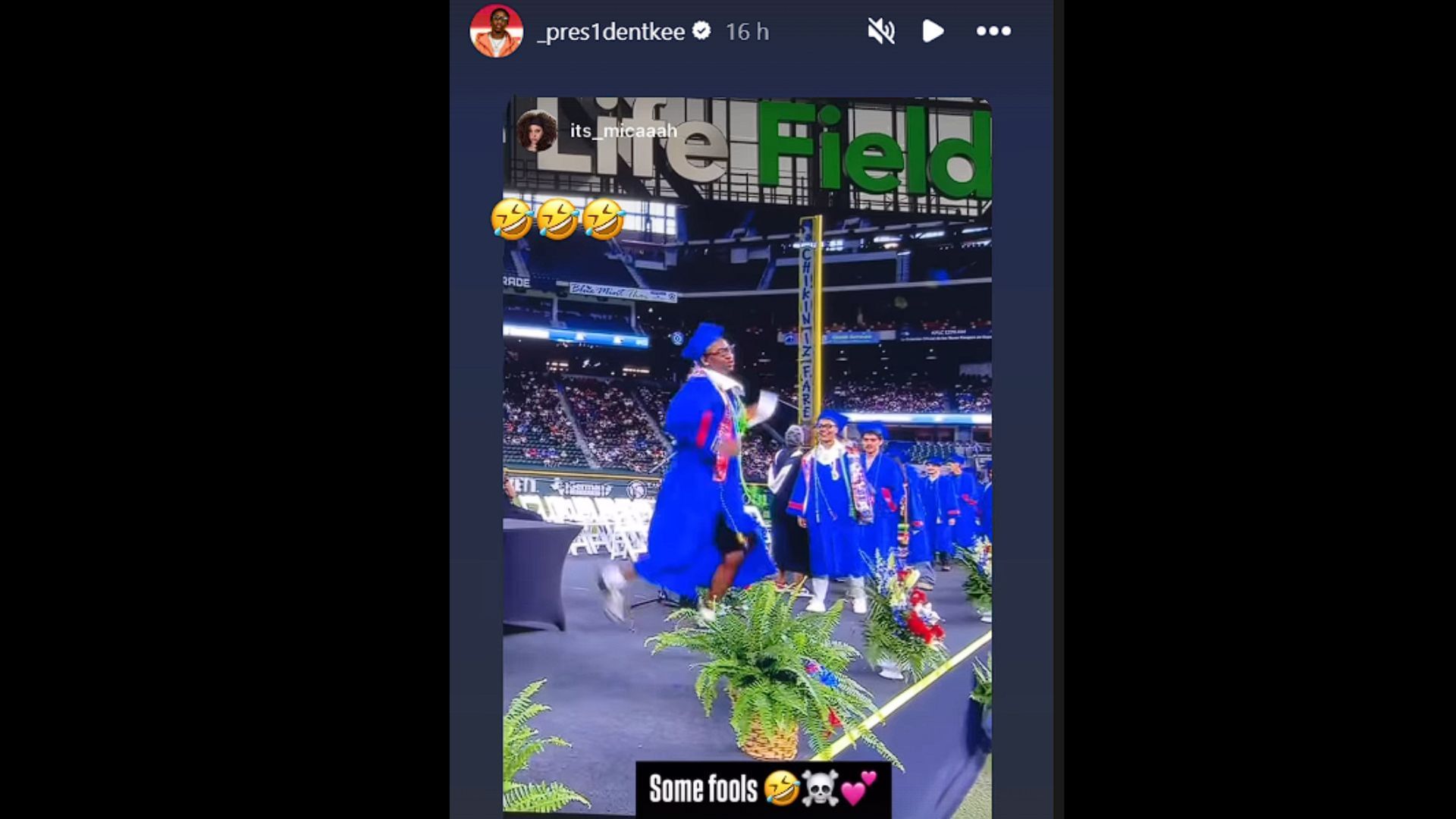 A playful video from his Duncanville High School graduation, where he leapt joyfully across the stage, resurfaced online and was reshared by Russell himself with laughing emojis.