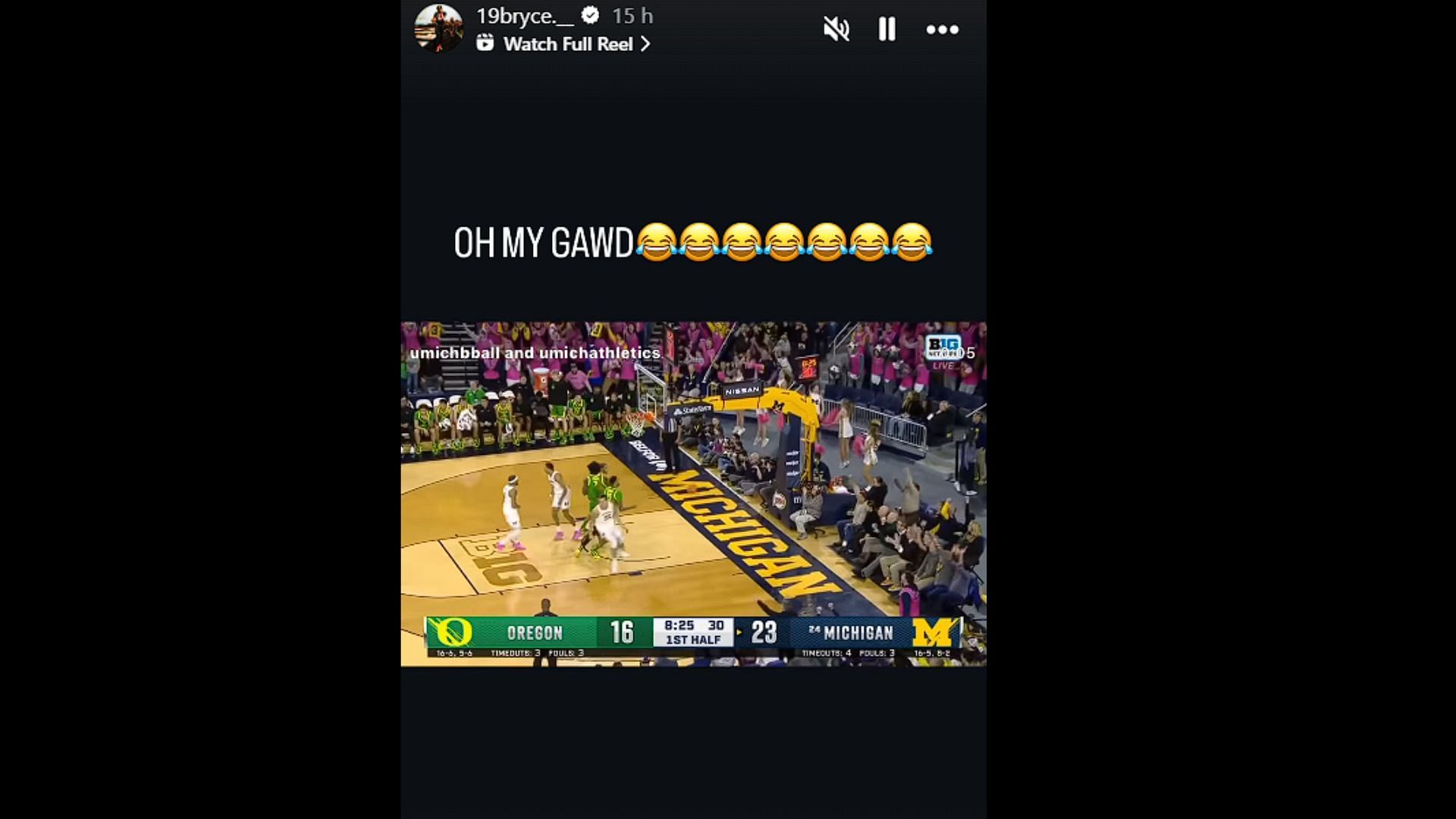 Michigan five-star signee Bryce Underwood couldn’t contain his excitement after witnessing Wolverines center Danny Wolf’s stunning deep 3-pointer against Oregon. The elite quarterback recruit shared his reaction on Instagram on Thursday, writing:
