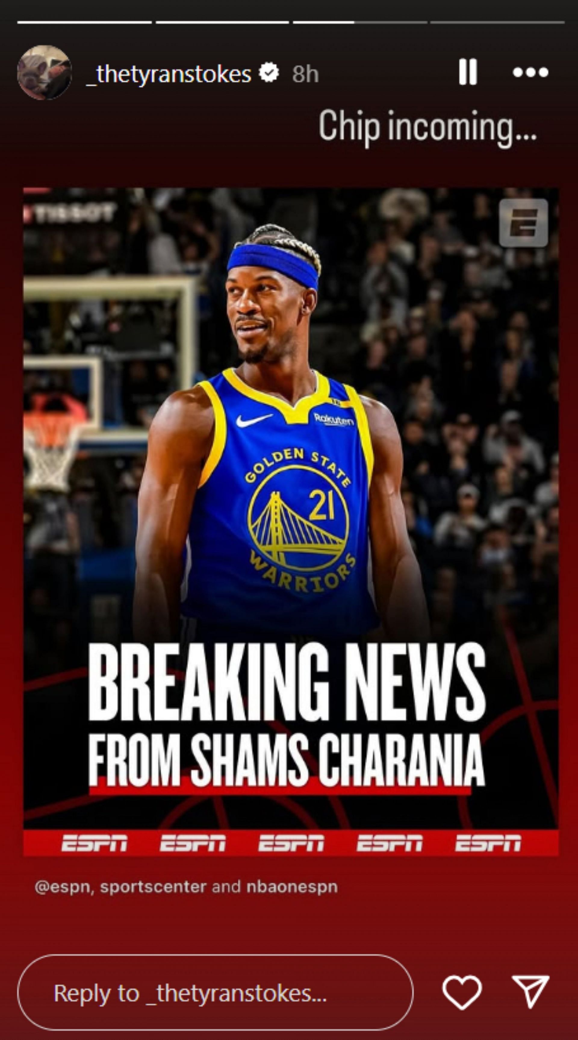 "Chip incoming...," Stokes captioned his story, referring to Butler winning a championship with Stephen Curry and the Warriors.