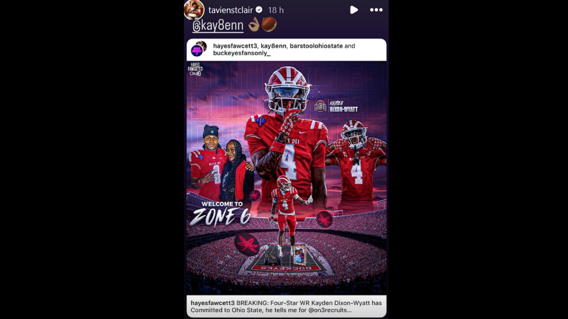 In a story posted to his Instagram, St. Clair reposted a striking commitment edit featuring Dixon-Wyatt in a Buckeyes uniform, adding the tag "@kay8enn" with a football emoji and the "OK" hand sign — a clear nod of approval.